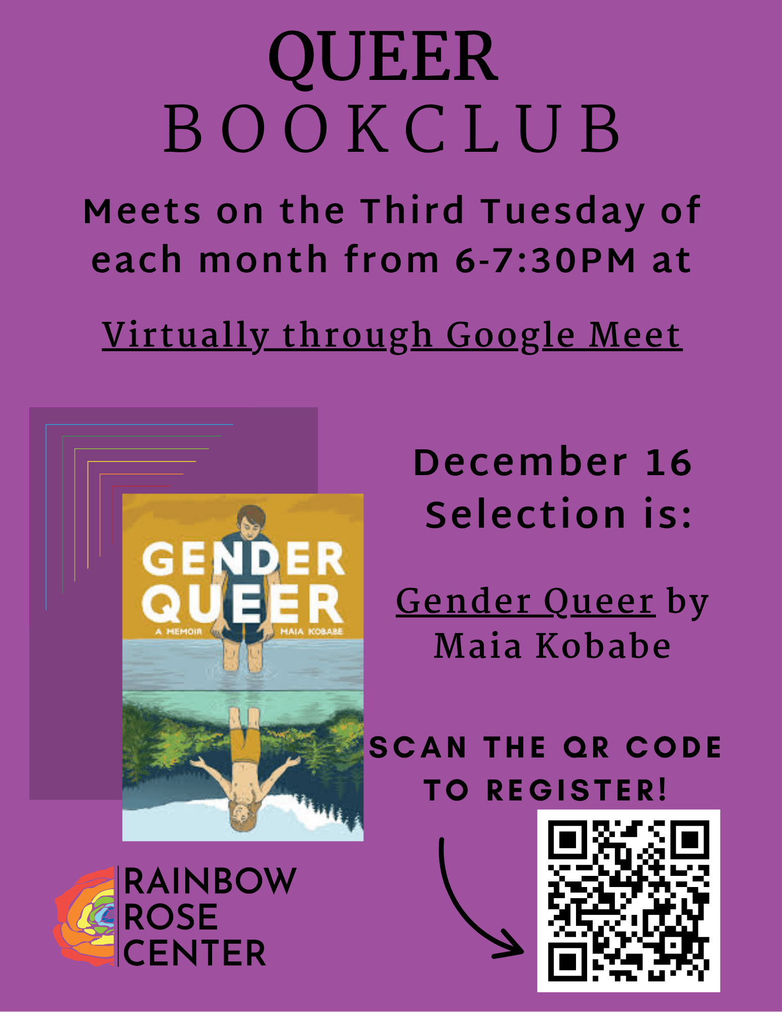 Join us in December for our Queer Book Club which now meets virtually on Google Meet! This month we will be reading Gender Queer by Maia Kobbe. You can find/request copies of the book from your local library.