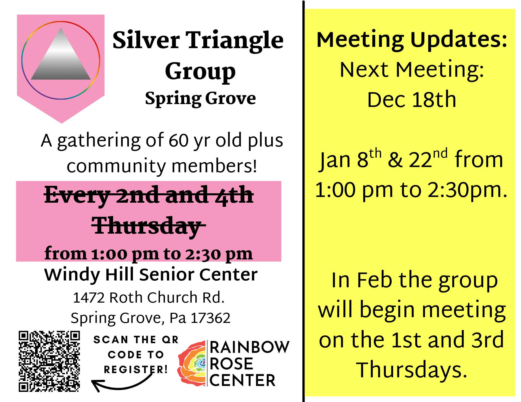 Please join our 60 yr old plus community members for our Silver Triangle Group. This group is held every 2nd and 4th Thursday of the month from 1:00 pm to 2:30 pm at Windy Hill Senior Center 1472 Roth Church Rd, Spring Grove Pa 17362. For any questions please email Christina at cwingert@rainbowrosecenter.org
