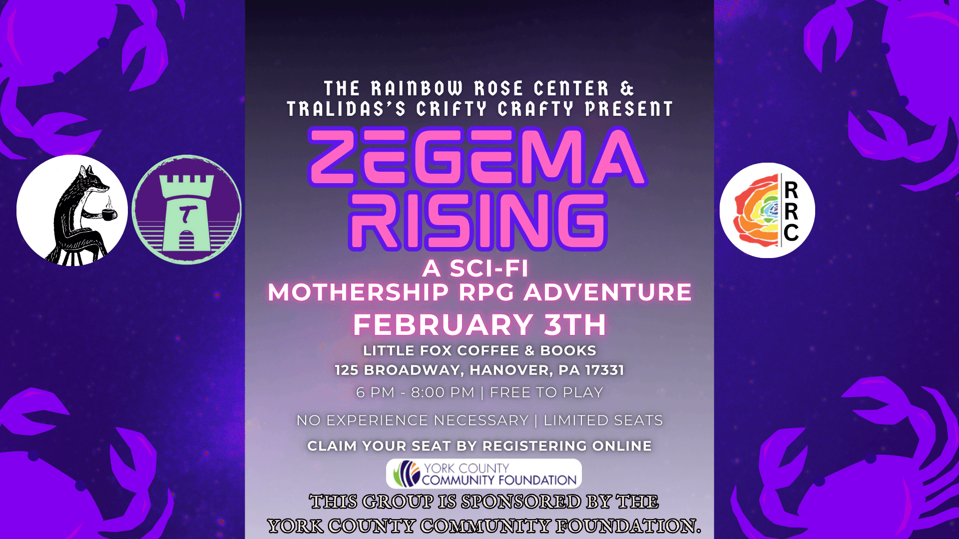 This event is part of our monthly TTRPG one-shot series, held on the first Tuesday of every month, facilitated by Tralidas’s Crifty Crafty and The Rainbow Rose Center, and generously sponsored by the York County Community Foundation. See less