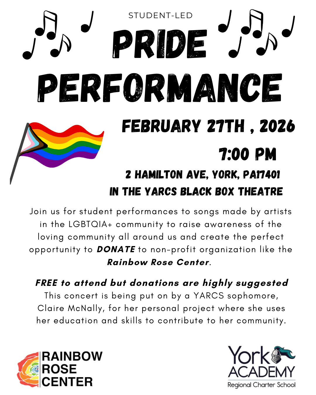 On February 27, 2026 at 7 pm, head to the YARCS Black Box Theater, 2 Hamilton Ave, York, PA 17401, for an evening of music performed by students honoring songs created by artists in the LGBTQIA+ community. This event raises awareness of the loving community all around us while creating an opportunity to give back through donations to nonprofits such as the Rainbow Rose Center.