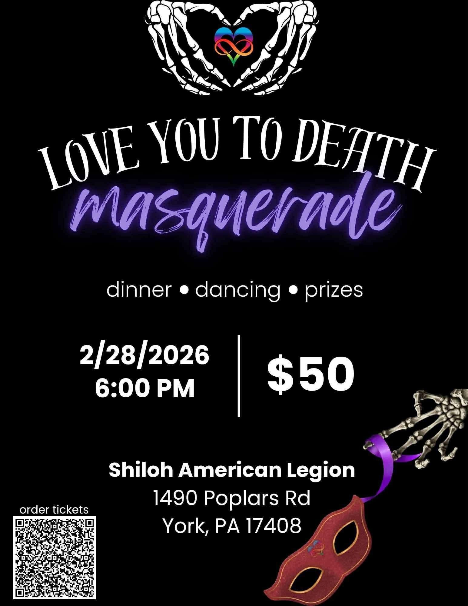 A formal Masquerade Ball at the Shiloh Legion on 2/28. We are extending the invitation to local LGBTQ communities. Tickets are $50 and include a buffet dinner, snacks, dessert, and nonalcoholic beverages. There is a cash bar for those who wish to drink. There will also be a DJ and lots of fun and prizes as well for best costumes. The theme is ‘Love you to Death’ and it is a spooky Valentine’s theme.