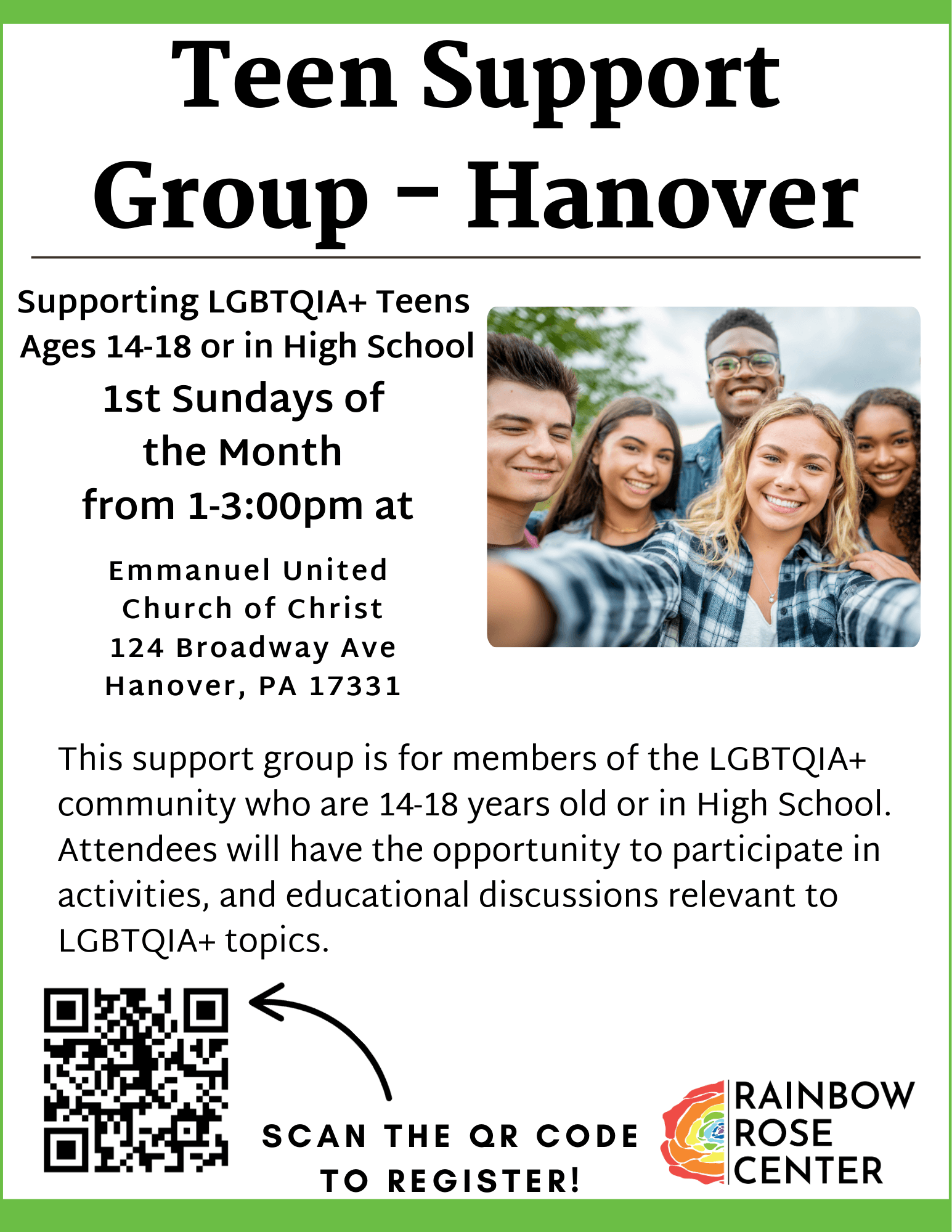 The Hanover Teen Support Group is a welcoming, in person space for teens to connect, share, and find support alongside peers in a safe and affirming environment. The group meets on the 1st Sunday of each month from 1:00 pm to 3:00 pm at Emmanuel United Church of Christ.