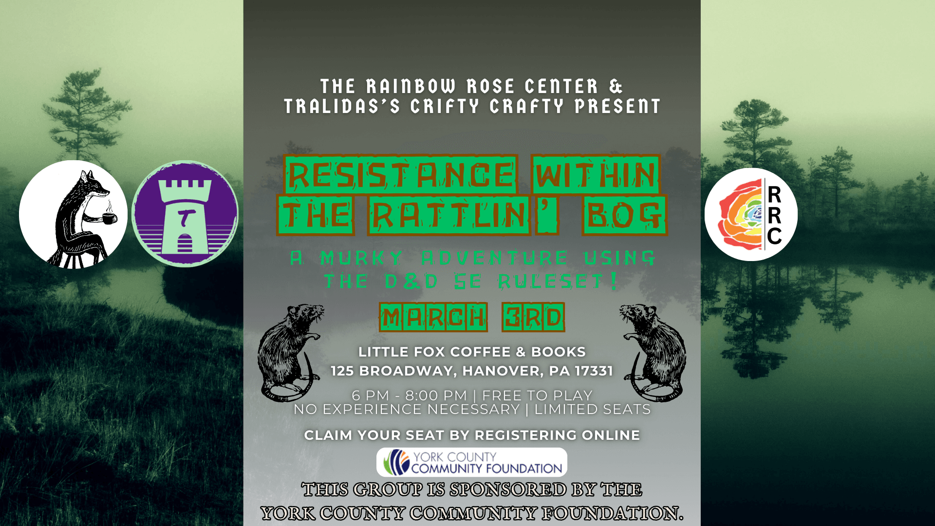 This event is part of our monthly TTRPG one-shot series, held on the first Tuesday of every month, facilitated by Tralidas’s Crifty Crafty and The Rainbow Rose Center, and generously sponsored by the York County Community Foundation.