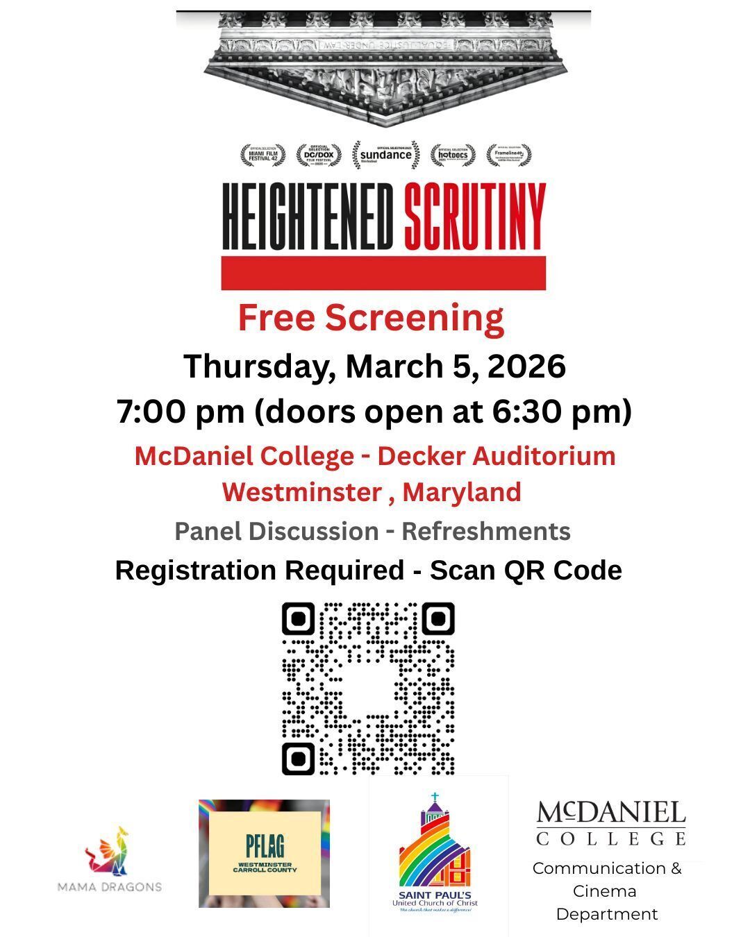 In partnership with the producers of the documentary "Heightened Scrutiny ", Mama Dragons, PFLAG-Westminster, St. Paul's UCC, and McDaniel College's Department of Communication & Cinema are offering a free screening of this award-winning film.