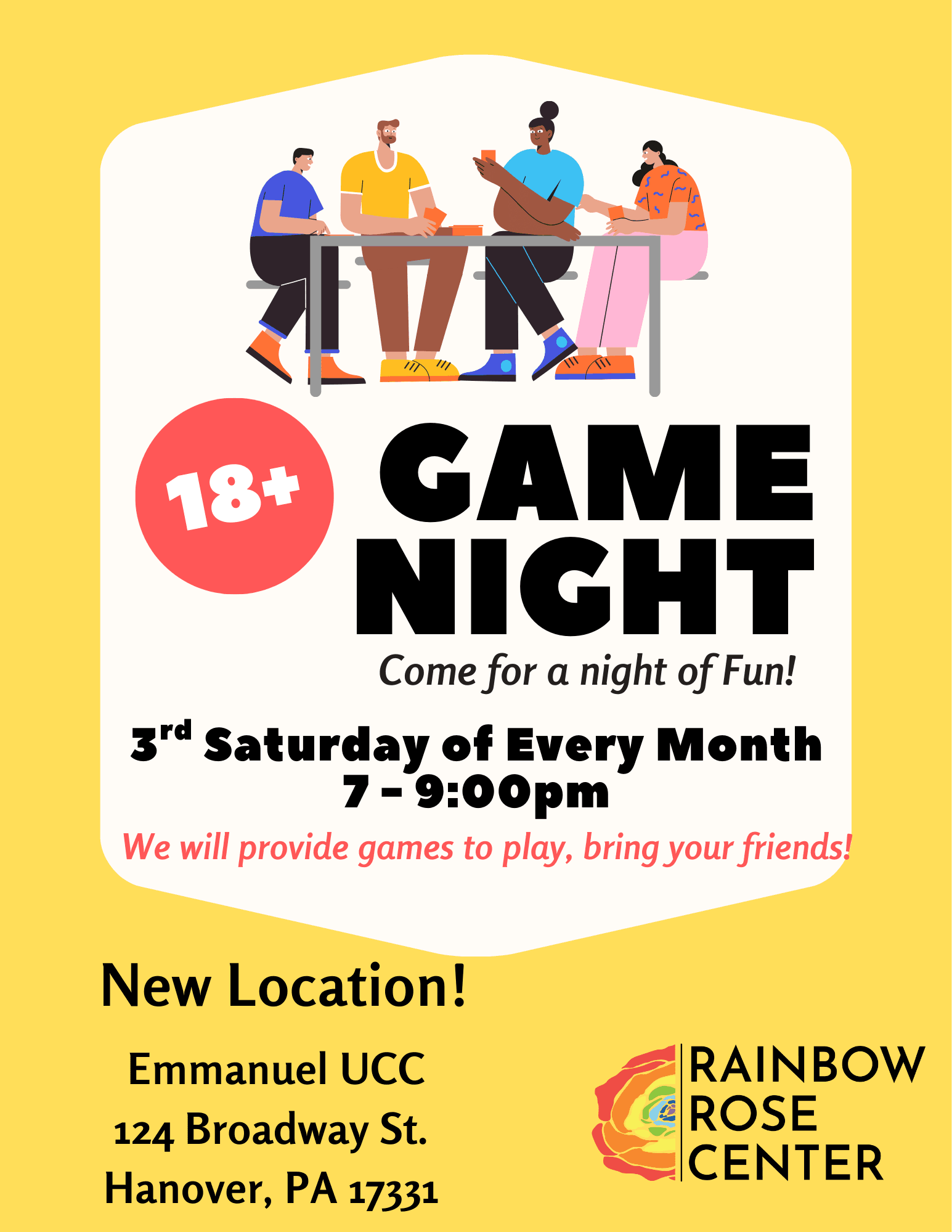 Join us every third Saturday from 7–9 PM at the Emmanuel United Church of Christ (124 Broadway, Hanover, PA) for Adult Game Night! Play classics and fan favorites like Ticket to Ride, Monopoly, Catan, Clank!, Unfair, Risk, and more. 18+ only!