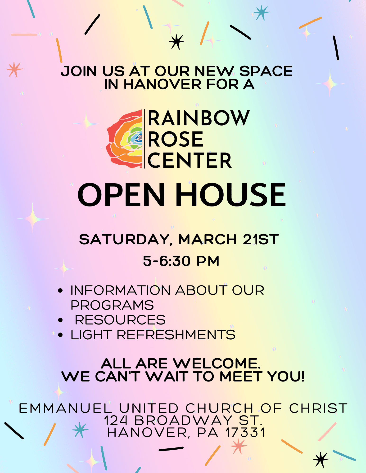 Join us as we celebrate our new Hanover location with a Rainbow Rose Center Open House on Saturday, March 21 from 5 to 6:30 pm at Emmanuel United Church of Christ, 124 Broadway, Hanover, PA 17331.
