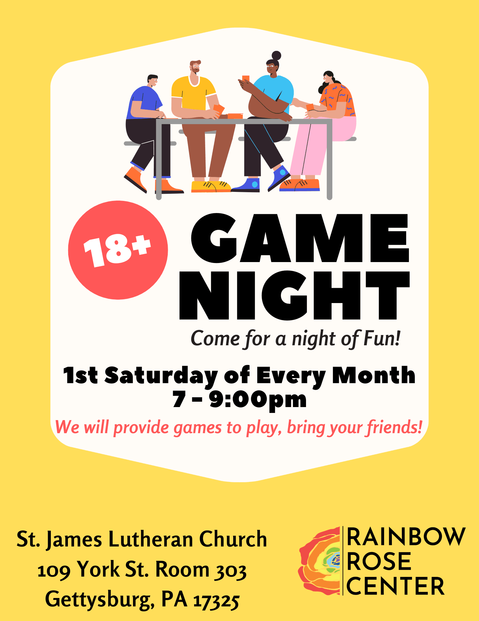 Join us every first Saturday from 7–9 PM at the St. James Lutheran Church (109 York St. Room 303, Gettysburg, PA 17325) for Adult Game Night! Play classics and fan favorites like Ticket to Ride, Monopoly, Catan, Clank!, Unfair, Risk, and more. 18+ only!
