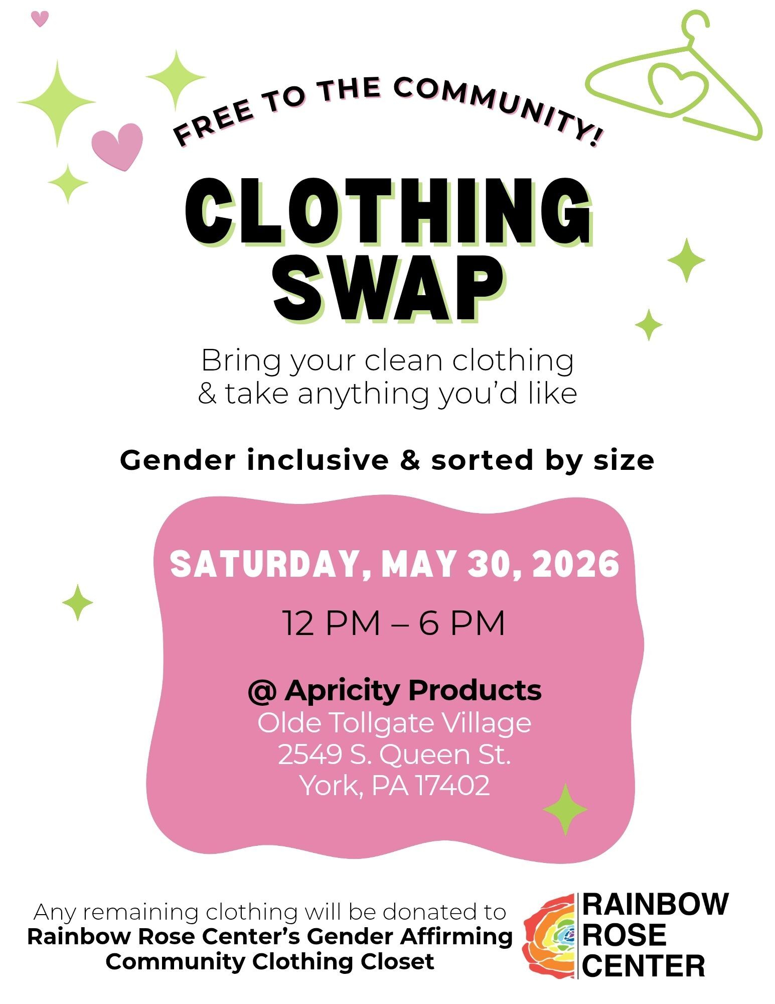Any clothing remaining at the end of the event will be donated to the Rainbow Rose Center’s Gender Affirming Community Closet, helping extend the impact of your contributions even further.