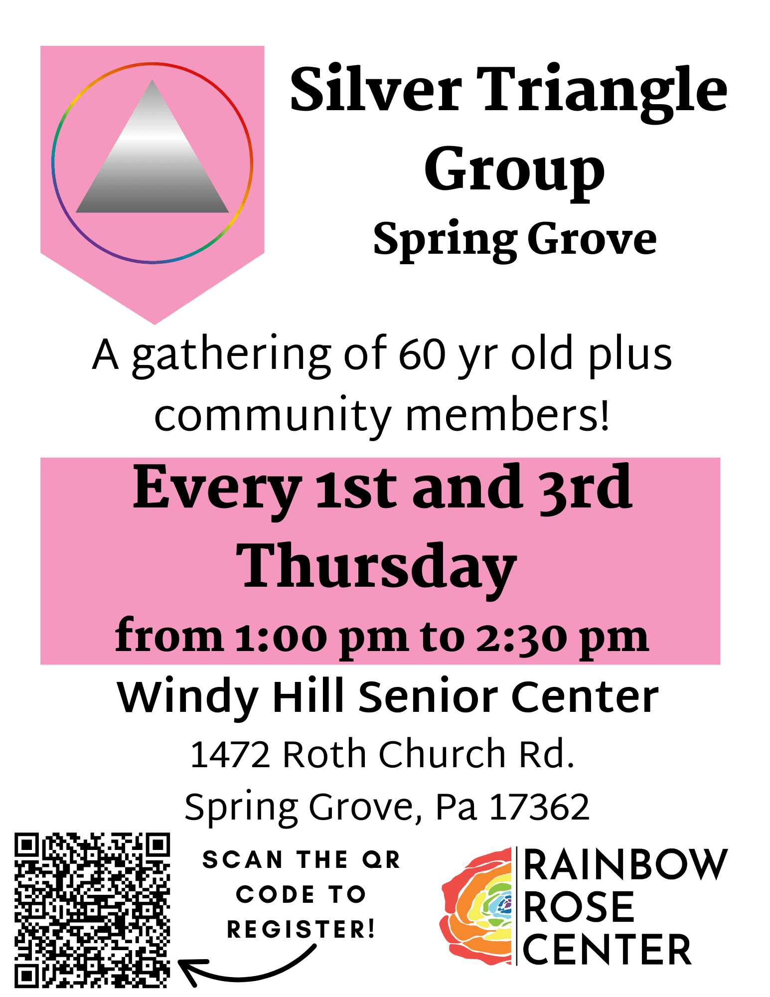 Please join our 60 yr old plus community members for our Silver Triangle Group. This group is held every 1st and 3rd Thursday of the month from 1:00 pm to 2:30 pm at Windy Hill Senior Center 1472 Roth Church Rd, Spring Grove Pa 17362. For any questions please email Christina at cwingert@rainbowrosecenter.org